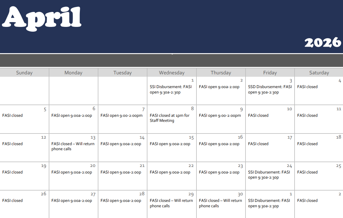 Closed Fridays [Unless Benefits are dispersed on a Friday/Saturday/Sunday, then FASI will be open Friday 9:30 AM – 2:30 PM.]